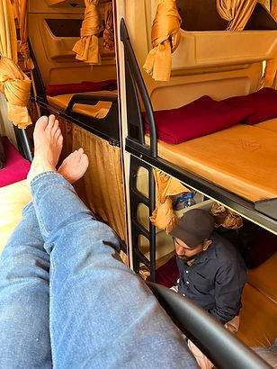 OK! So, of course, I hadn't snapped a photo of the bus when I boarded -- I was just so freaking happy to be on it and to see that it was on time. I think my vids and pics below will portray the journey, but this is what the sleeper bus looks like on the outside and there are many like this. (There are also many that are delapidated, not air-conditioned, and not at all appealing.) I specifically had NOT booked a sleeper with my friendly travel agent but, again, after a pain-in-the-ass 4am-noon day, I would have hopped on the back of a two-wheeler to get myself to Bangalore and live the life I wanted to live. Fare: $22 incl all fees and such.